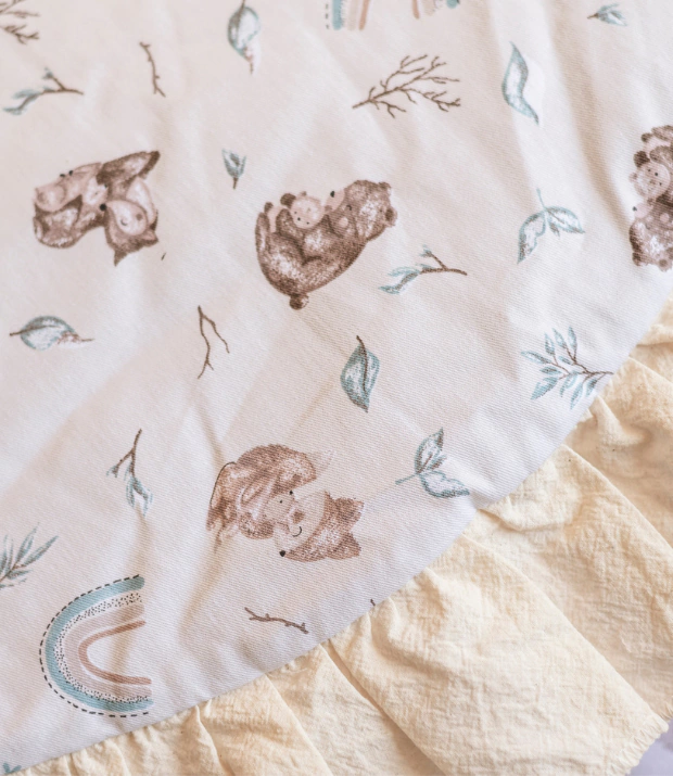 Alfombra de juego redonda reversible, extra acolchada y con volados. Tiene un diámetro de 1 metro y está rellena con dos capas de guata. Confeccionada 100% tusor de algodon en tonos lisos de un lado y estampada del otro.